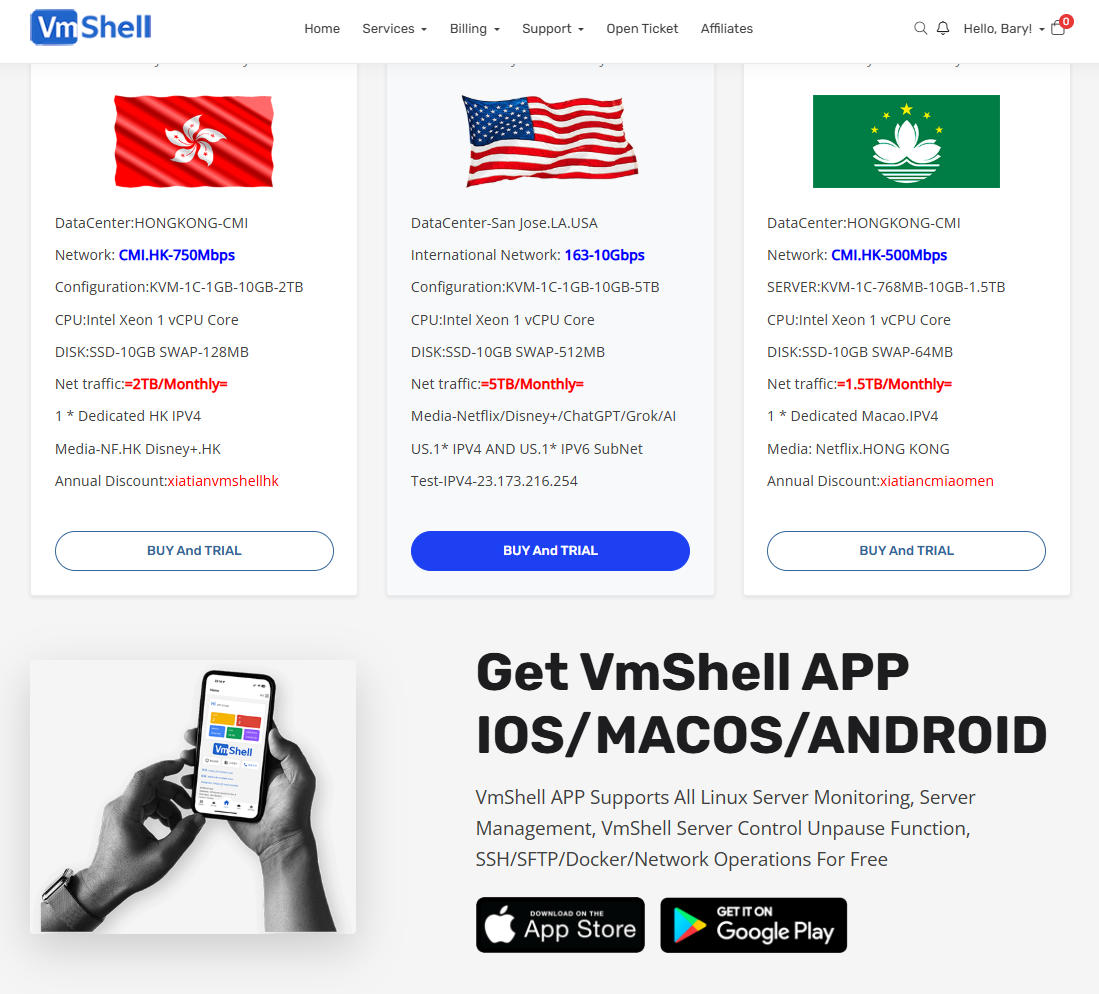 关于VmShell INC ,VmShell提供香港CMI线路的虚拟服务器和独立服务器(由于是美国公司,请遵守美国法律要求的服务内容),香港支持奈菲+迪斯尼+北美OPENAI线路;ToToTel北美圣何塞数据中心提供10Gbps线路的互联网接入基础服务,解锁北美所有流媒体(包括HULU和北美Tiktok/CHATGPT运营),同时子品牌ToToTel提供更加专业强劲的CPU和免费灾备服务给专业人士更多选择,而且还有不限流量的产品!